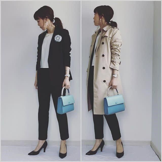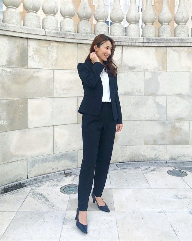 シンプルなネイビーセットアップなら、セレモニーらしく、硬すぎず、抜け感もある、王道のオケージョンスタイルに!卒業式はパンツで、入学式は同トップスにスカートでアレンジしてもOK!