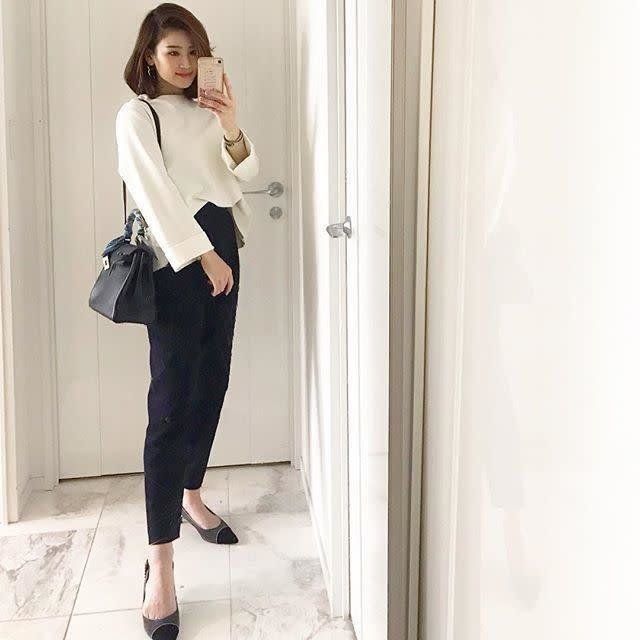 こちらもベーシックな黒パンツにハリ感のある、きれいめな白ブラウスを合わせ、オケージョン対応のパンツスタイルに。