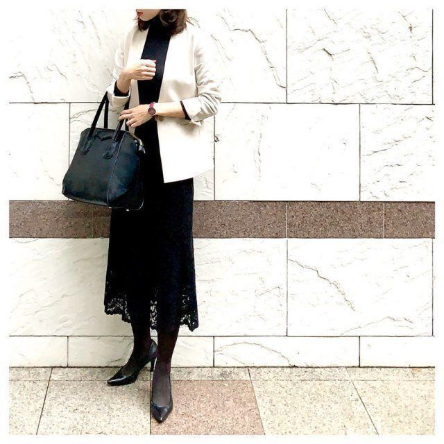 写真のようなレーシーなスカートにも「ノーカラージャケット」を合わせれば、クールで、レディーライクなセレモニースタイルに。