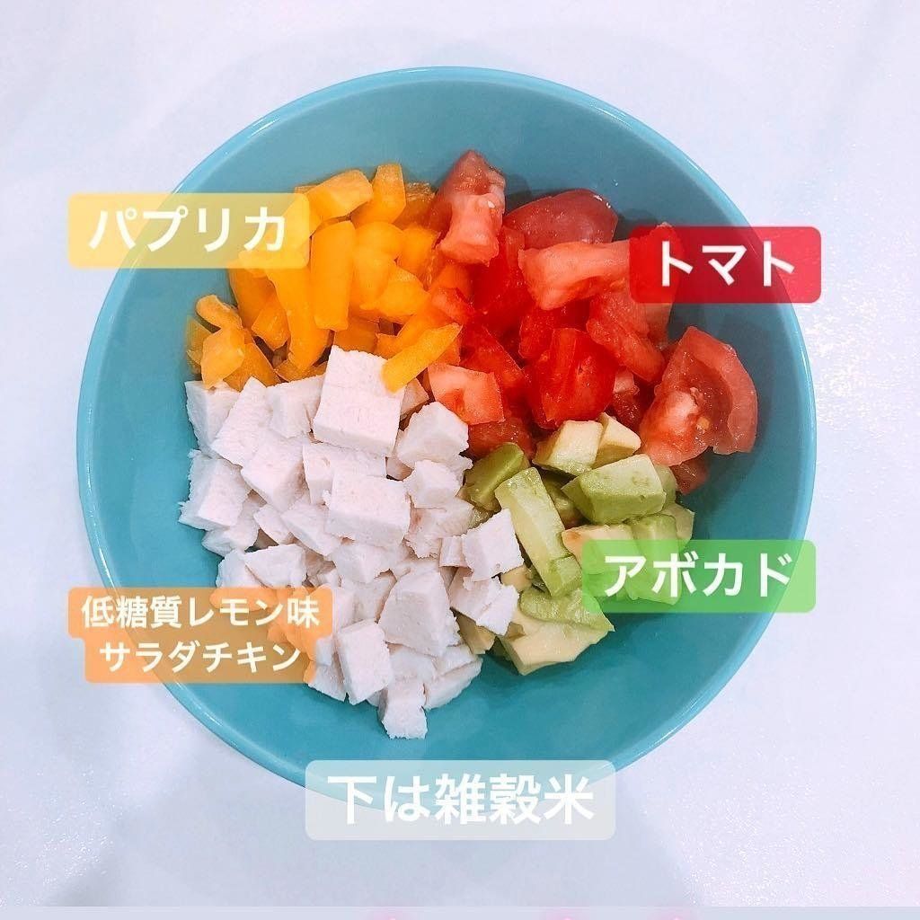 こちらは、雑穀米の上にパプリカ、トマト、サラダチキン、アボカドを乗せたサラダボウル。ダイエットメニューをつくるときには、低糖質カフェなどに行った際のレシピを自宅でマネするのだとか。お家でカフェ気分を味わいながらダイエットできるなんて、ステキなアイデアですね!