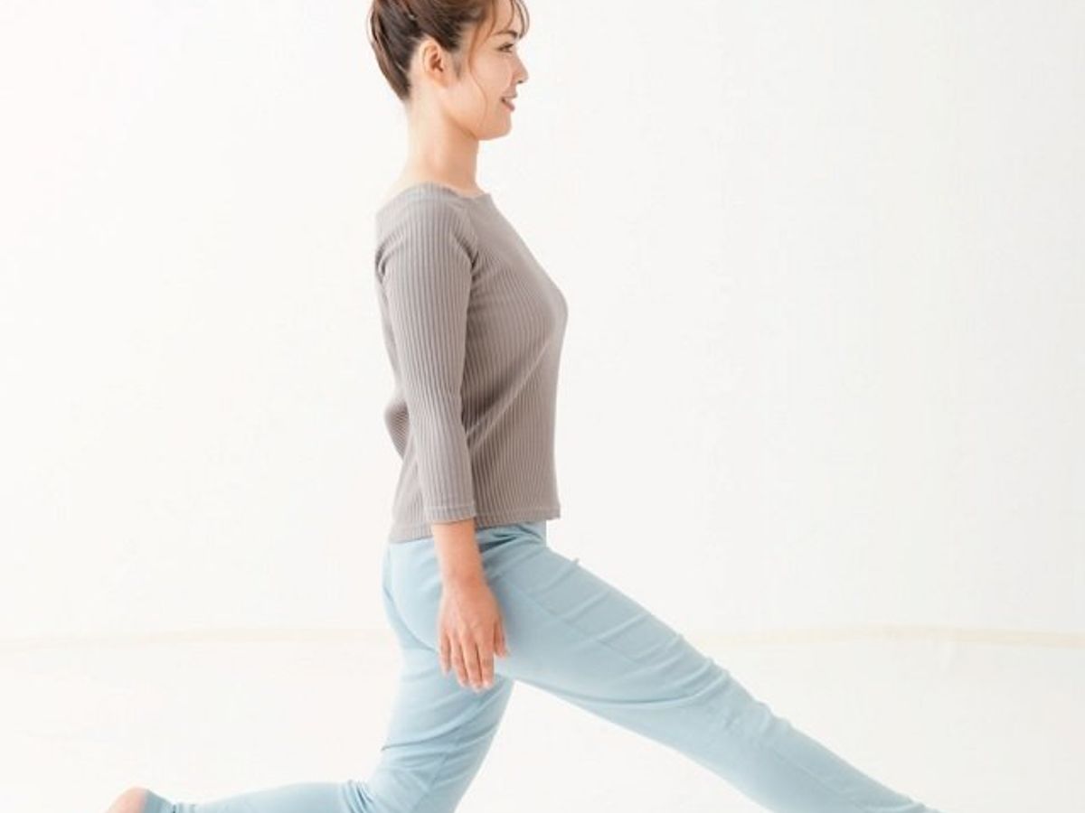 骨盤の傾きを正常に戻し、重心のバランスを整えるストレッチ。猫背などの姿勢の悪さが改善され、ふだん使われていない筋肉が刺激されます。体中の筋肉が使えれば、代謝が上がりやせやすい体質に!