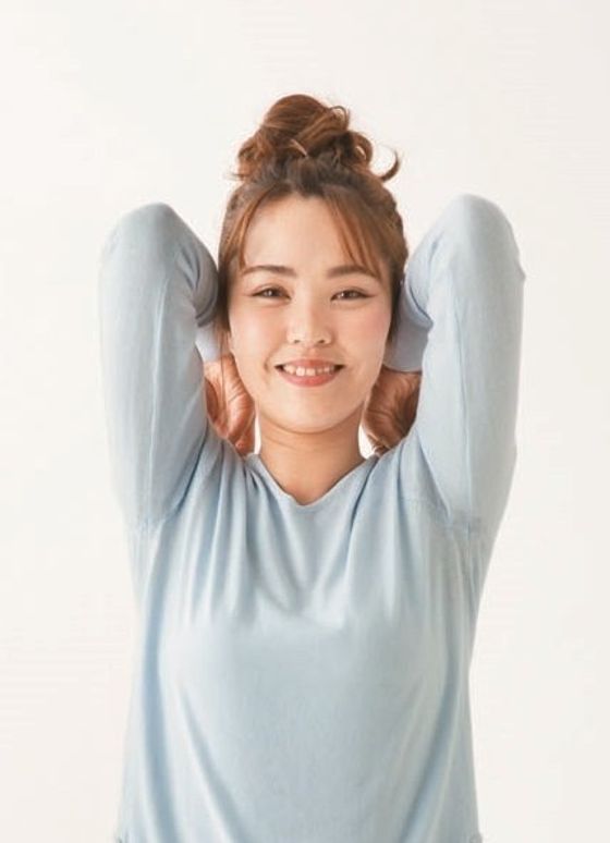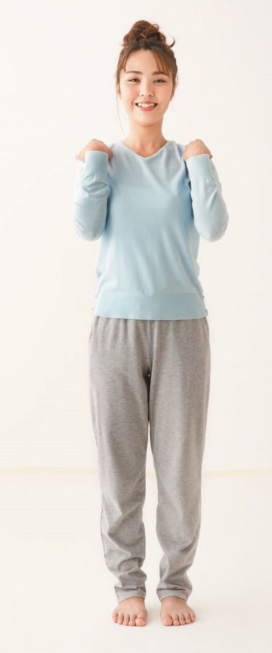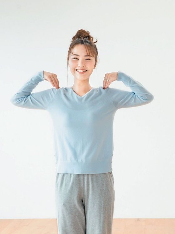 立つ、またはいすに座り背すじを伸ばし、両手の指先を肩の上に置く。ひじが胸の横にくるよう、わきを締める。
