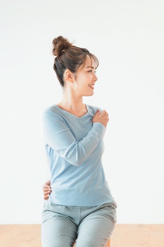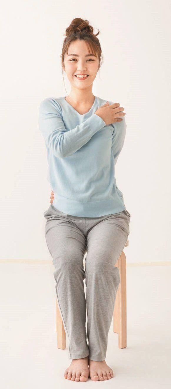 いすに浅く腰かけて背すじを伸ばす。右手で左の肩先(腕のつけ根の先)をつかみ、左手は背中側から右の腰骨あたりをつかむ。