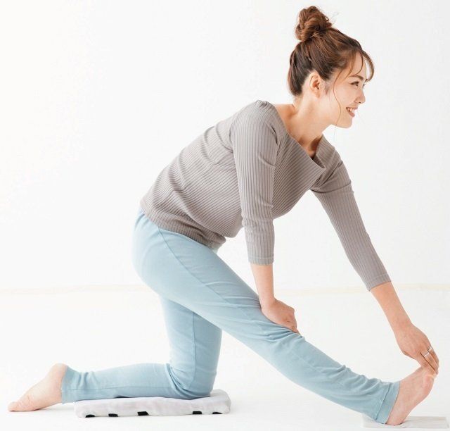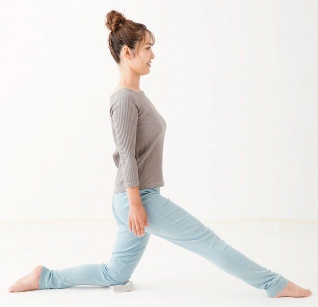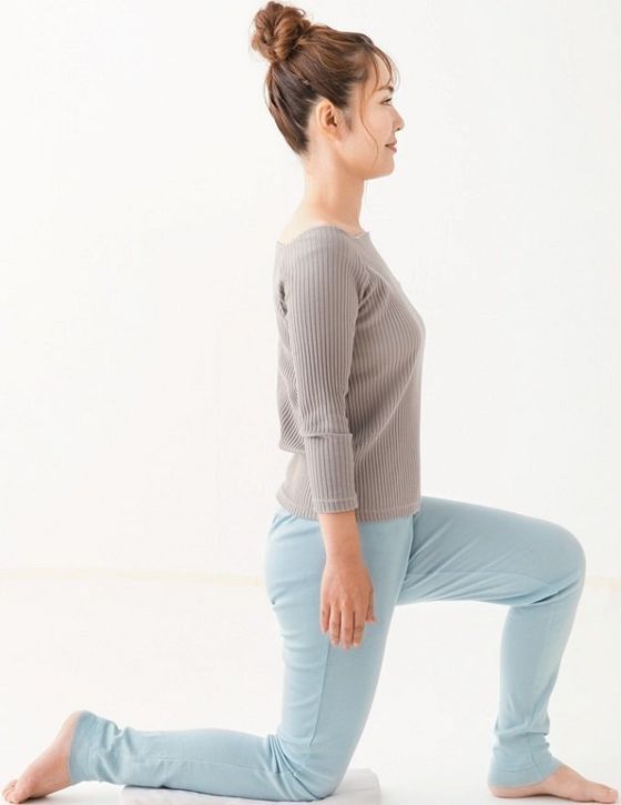 床にひざ立ちになる。左脚を前に出してひざを直角に曲げ、背すじを伸ばす。右ひざが痛い人はタオルを敷く。
