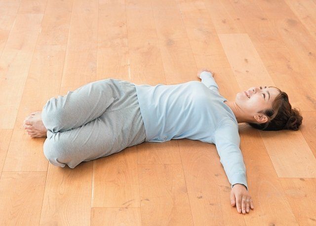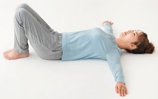 床にあおむけになり、両腕を左右に伸ばして手のひらを床につける。両ひざを立てて、かかとをお尻から10㎝の位置まで引き寄せる。