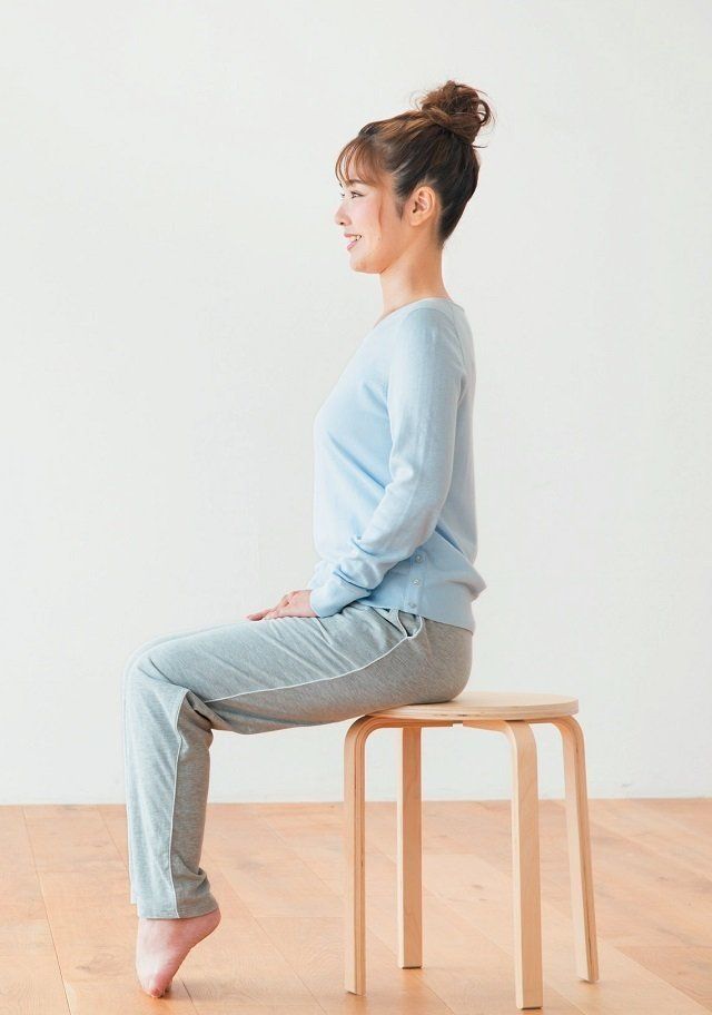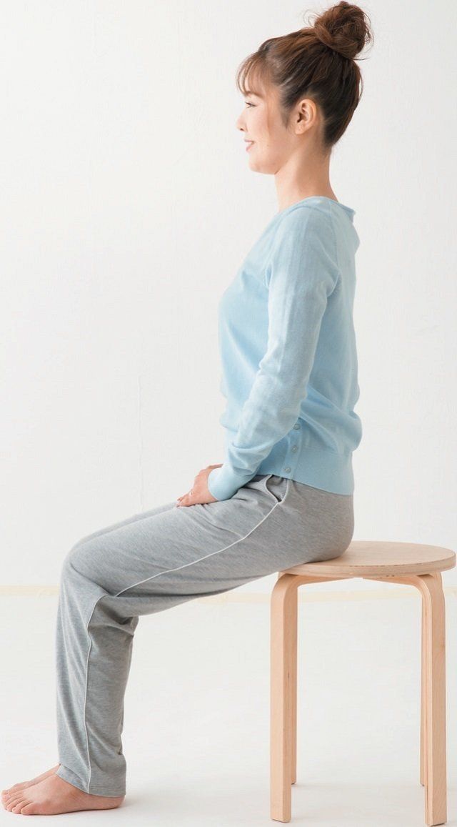 いすに浅く座り、お尻と太ももの境目に重心をのせる。背もたれによりかからず、脚は軽くとじ、視線はやや斜め上に向ける。