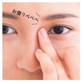 指を眉頭に当てて、眉頭にのせた色を目頭までスッとぼかす。アイブロウを少し借りて、ノーズシャドウにし、目元の彫りを深めます。