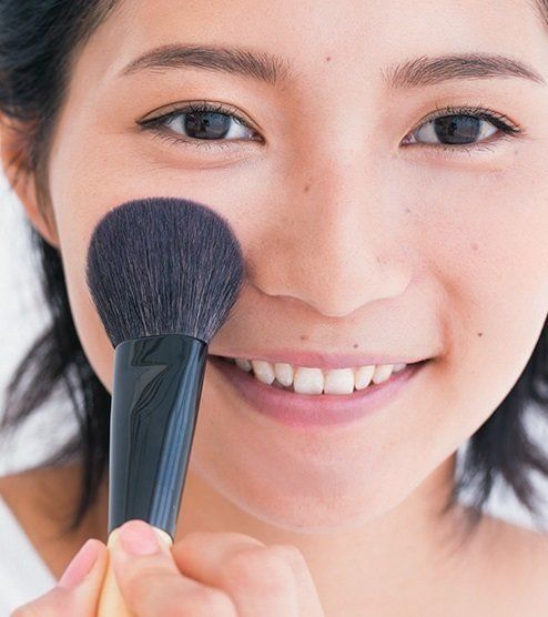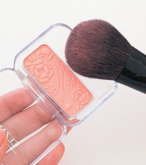 小さなブラシはムラになりやすいので大きなブラシがおすすめ。ブラシにチークをたっぷりと含ませて、手の甲で余分な粉を払います。