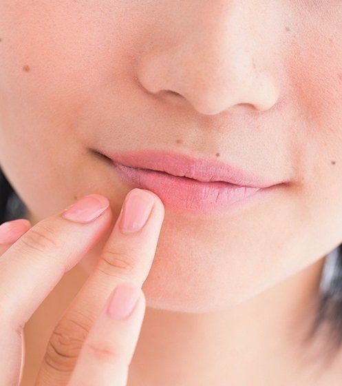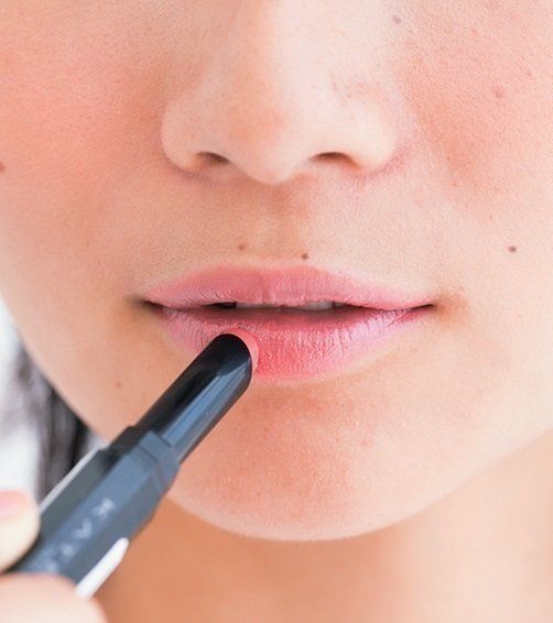ざっくり塗っても、塗りっ放しでは下品な口元。リップラインを取らない代わりに、指先で唇の輪郭をぐるりと1周さわって、〝縁ならし〞を。