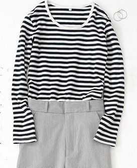 素材や色が上品なワイドパンツは、ボーダーTシャツとの相性も◎。