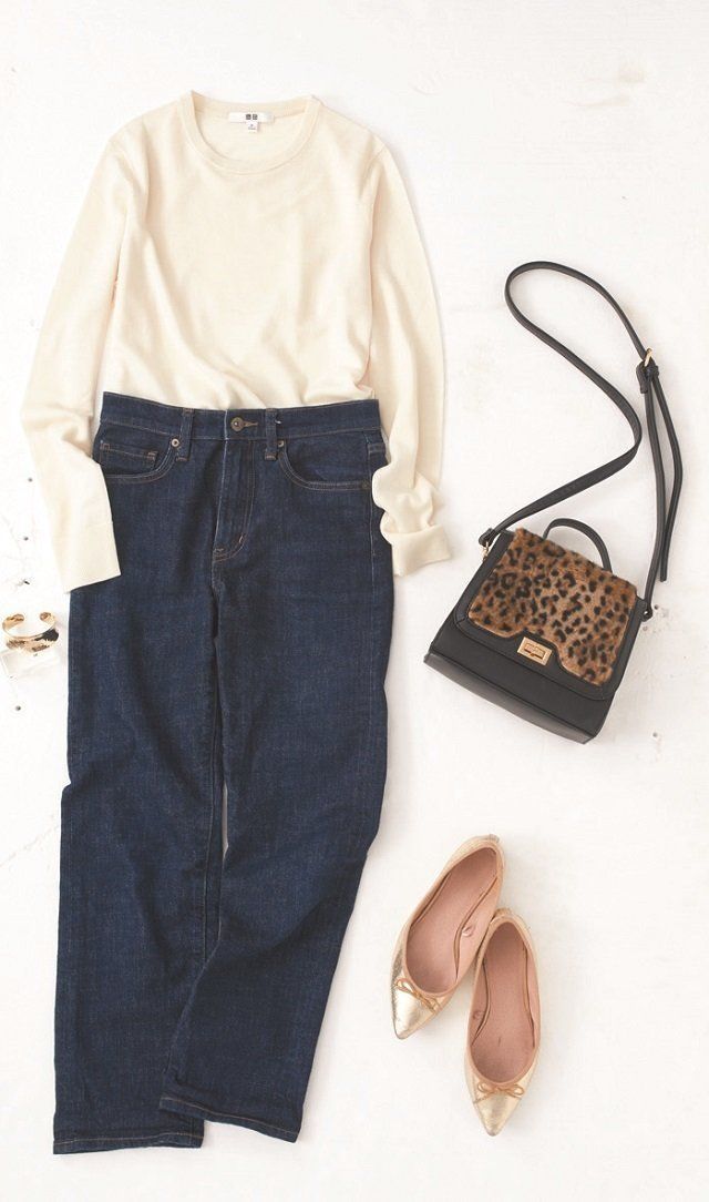 ド定番のニット×デニムの組み合わせには、派手バッグでアクセントを。足もともゴールドにすれば、いつもの服がおでかけ仕様に!