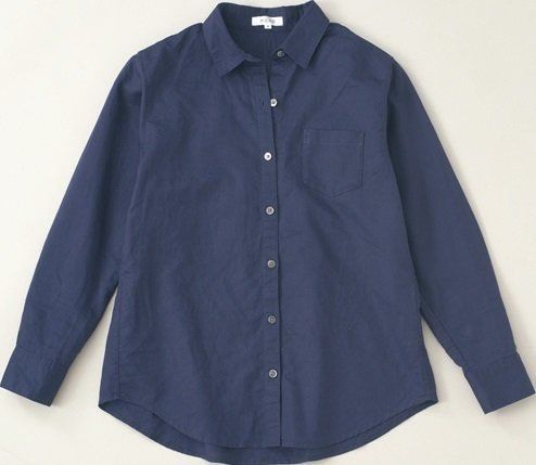 王道のシャツは高見えするネイビーで、写真はPLSTのもの(私物)。意外と着こなしが難しいシャツですが、襟が小さなものを選ぶと、だれでも違和感なく着られます。