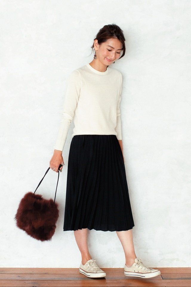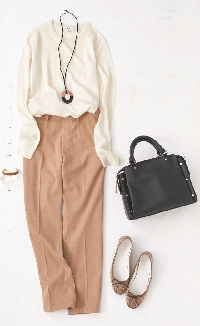 シンプルで使いやすい無地ニットは、油断すると地味コーデに陥りがち。着こなしのポイントになるバッグやアクセをプラスすることで、こなれ感がUP!