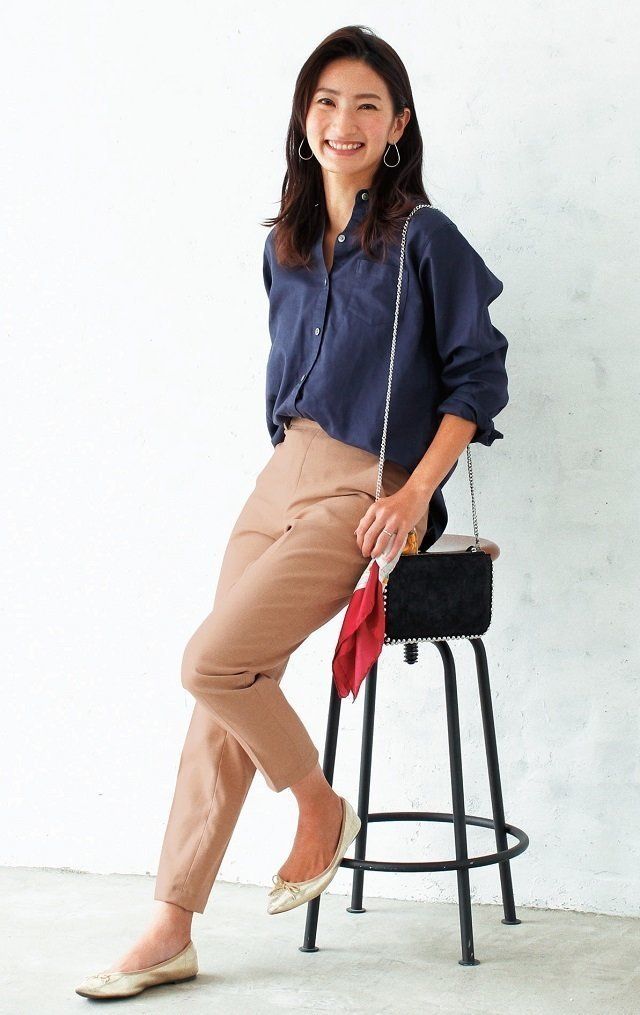 パンツはきれいめ&足首見せで抜け感を演出。大ぶりピアスやスカーフで色気を出して。