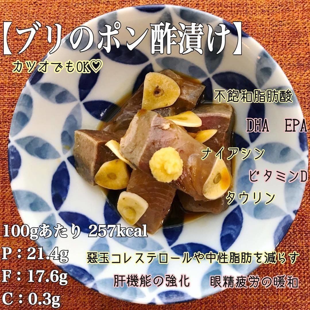 脂質は魚でとることが多いというeri.i_1to10さん。週に1度は、生魚を漬けにして食べています。つくり方は、ポリ袋ににんにくスライス・青じそ・ポン酢・カットしたブリやカツオを入れてよくもみ込み、空気を抜いて1日くらい浸けておくだけ。生魚の臭みが苦手という人でも、これならおいしく食べられるそうですよ。