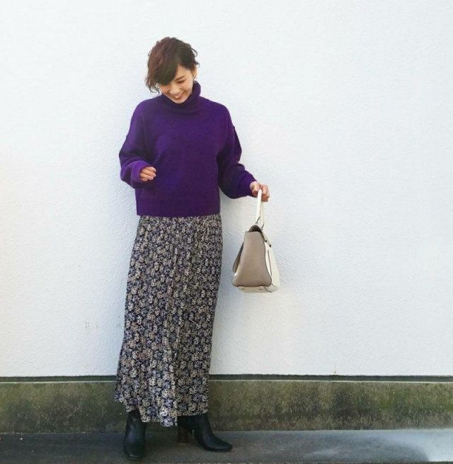トレンドのざっくりタートルネックニットで首と手首を、小花柄のマキシ丈スカート&ショートブーツで足首をしっかり温めます。