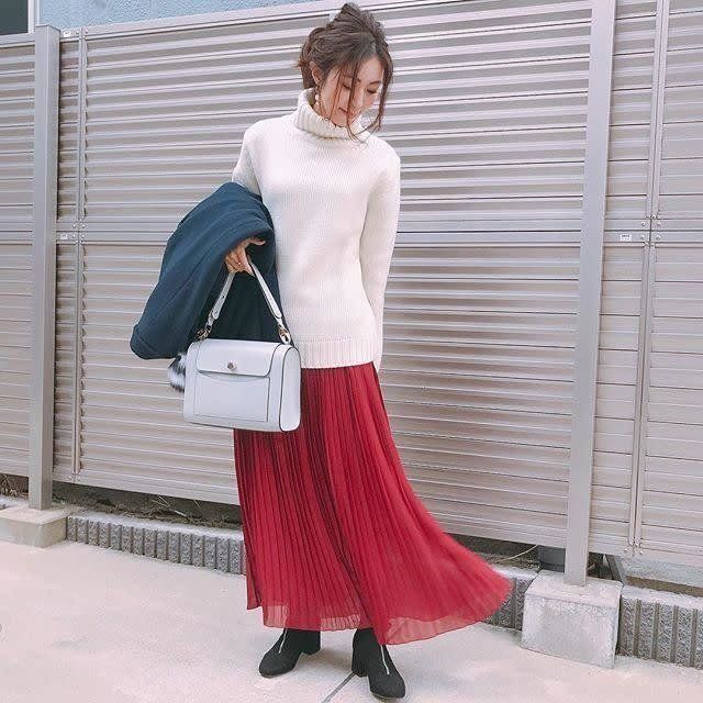 昨年末から大トレンドのロングプリーツスカートは、冬コーデが軽やかに見える明るいカラーがおすすめ。トップスはゆったりとしたローゲージタートルニットを合わせて、リラックス感を出して。