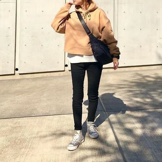 立ち上がりのしっかりあるパーカーなら首もあったか。小顔効果もあり!ボトムスはスマートな裏起毛タイプを合わせると、防寒&細見えも期待できますよ。さらに足元をハイカットスニーカーでホールドして、いざご近所へ!