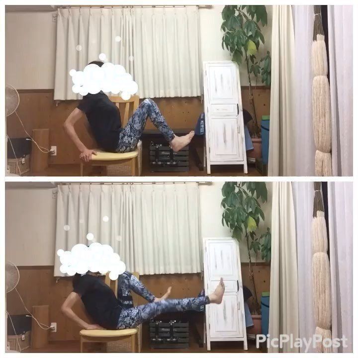 こちらは、イスを使った下腹トレーニング。イスにお尻をのせて上体を少し後ろに倒し、上半身と下半身を同時に引きつけたり、足を左右交互に自転車をこぐように動かしたりしていきます。テレビを見ている間などの、ながらトレーニングにもおすすめです。