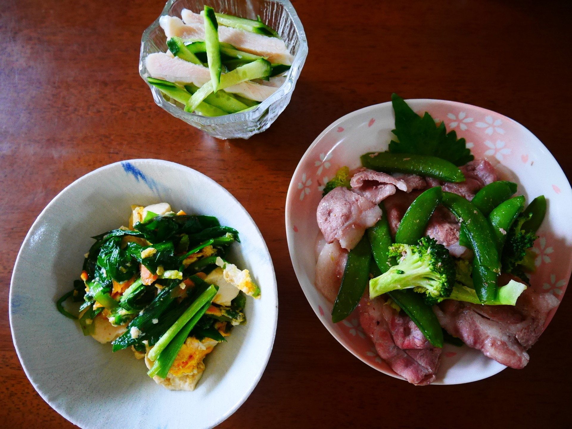 この日の食事メニューは、豚ばら肉・スナップエンドウ・ブロッコリーの炒めものに、木綿豆腐を使ったニラ玉豆腐、きゅうりとサラダチキンの和えもの。味つけは、砂糖の代わりにカロリー0の甘味料「ラカント」を使用しています。野菜とタンパク質をたっぷり食べることで、ご飯なしでもお腹いっぱいになるそうです。