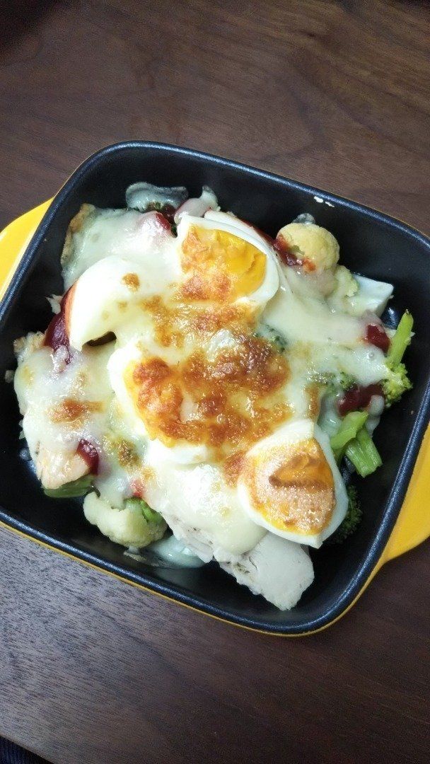 正月太りを解消するために、ブロッコリーとカリフラワーのグラタン風をつくったまーこさん。つくり方は、電子レンジで加熱したブロッコリーとカリフラワー・ゆで卵・サラダチキンに、少量のケチャップとチーズをかけてトースターで10分焼くだけ。たっぷりの野菜とタンパク質で、満腹感もしっかり得られるメニューです。