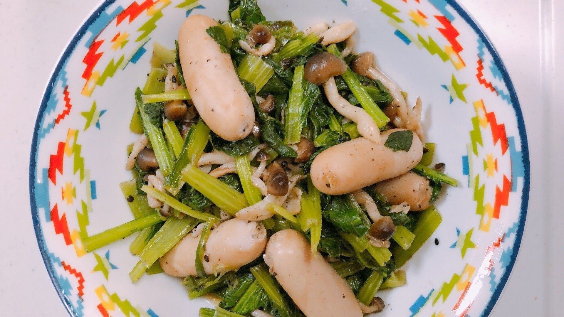 そのために、私が食生活で意識していることは、本当にたったこれだけ!とにかくたくさん野菜を食べます。写真はある日のおかず。小松菜とキノコの炒め物。野菜の分量が多いですね。