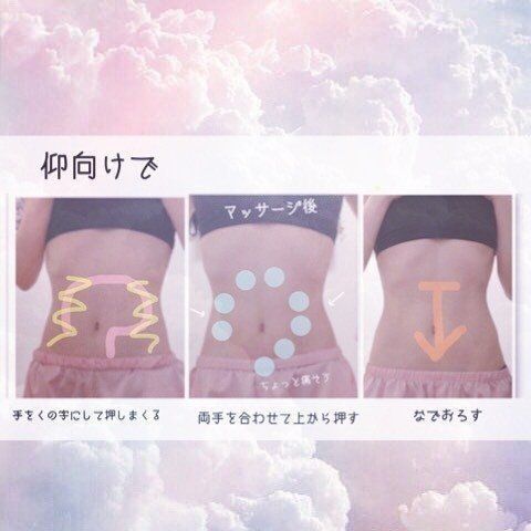 起床後と就寝前に腸マッサージをしているpu_diet_さん。仰向けの状態で、手をくの字にして丸を描くように押していきます。こうすることで、便秘解消効果が期待できるのだとか。マッサージ後には両手を合わせて上から押して、なでおろすようにしています。腸の動きにあわせて、大きな円を描くようにするのもポイントです。