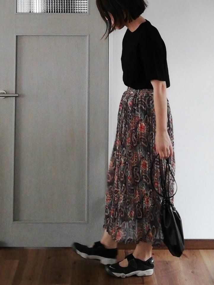 ワッフルT×古着スカートのリラックスコーデ。ワッフルTの黒と黒ベースのペイズリー柄スカートをリンクさせてまとまりよく。抜け感あるナイキのスニーカーを合わせて力の抜けたリゾート風をイメージした着こなしに。レザーの巾着バッグでほどよい大人っぽさをプラス。巾着バッグはLOWRYS FARMのもの。
