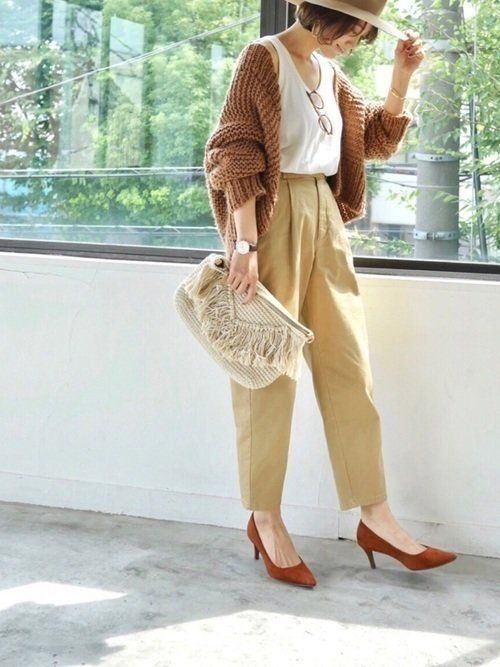 ベージュトーンに同系色のブラウンを差すことで、コーデをなじませつつも引き締めることができます。色を統一させるときは、コットンやニット、スエードなど、素材感を変えて遊ぶとさらに上級者!チノパンがGUのもの。