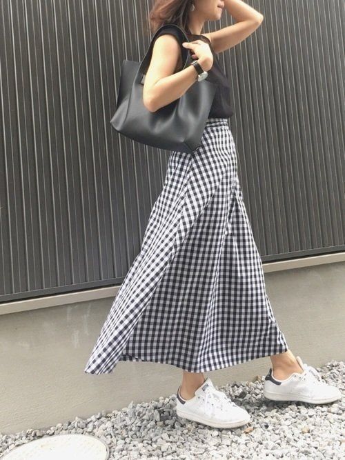 タンクトップにサンダル、ウエストポーチ、キャップと、王道カジュアルなアイテムも全て黒で統一すれば、夏らしいマドラスチェックのフレアスカートも落ち着いたトーンに。どんなスカートにも使える便利コーデです。