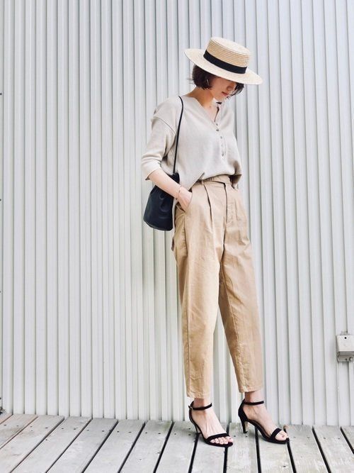 GUのチノパンツは、足のラインを拾わないテーパード型。生地にハリ感があるのでプチプラに見えません。トップスもベージュで統一し、小物はすべてブラックで締めれば、簡単にシャープなルックが完成します。