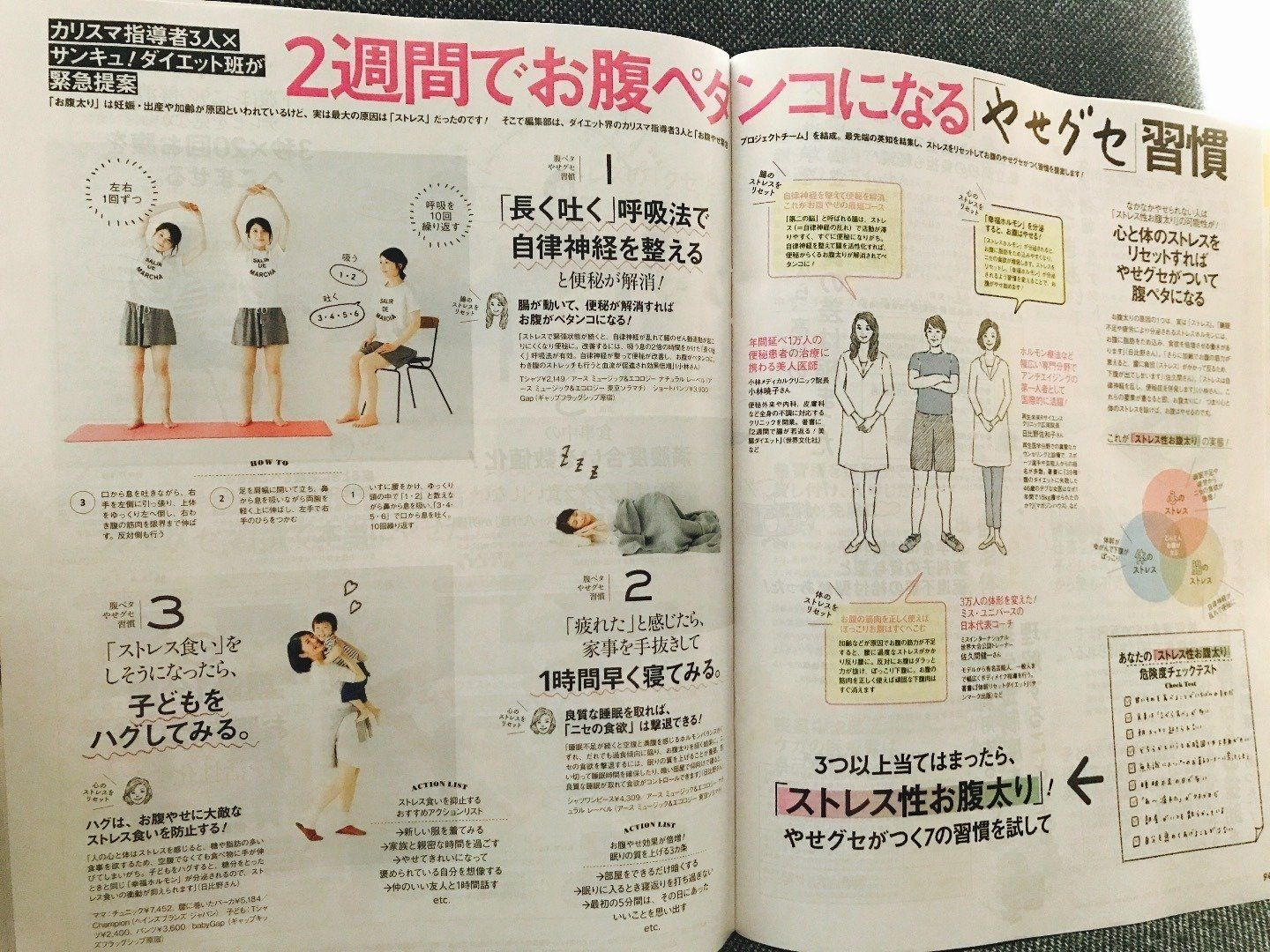 2週間「やせグセ」習慣を実践した石川紗世さん。長く吐く呼吸法で自律神経を整え、疲れを感じたときには家事を休んで早寝します。ストレス食いの誘惑には子どもをハグ、満腹度合いを数値化してダラダラ食いをしないなどのルールも設定。またテレビを見ながら3秒間お腹をへこませることを20回行い、朝晩1分間お腹をねじり腸を活性化させるなど、軽い運動も取り入れました。