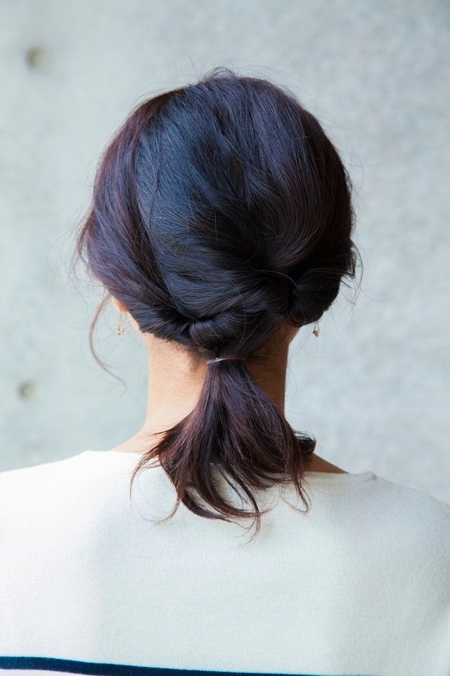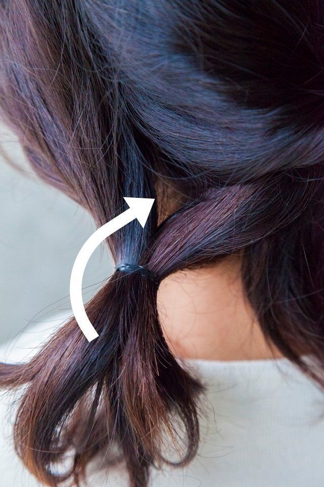 結び目を少し下げ、結び目の上にすき間をつくる。毛先側の毛束を上から下に通し1回転させる。