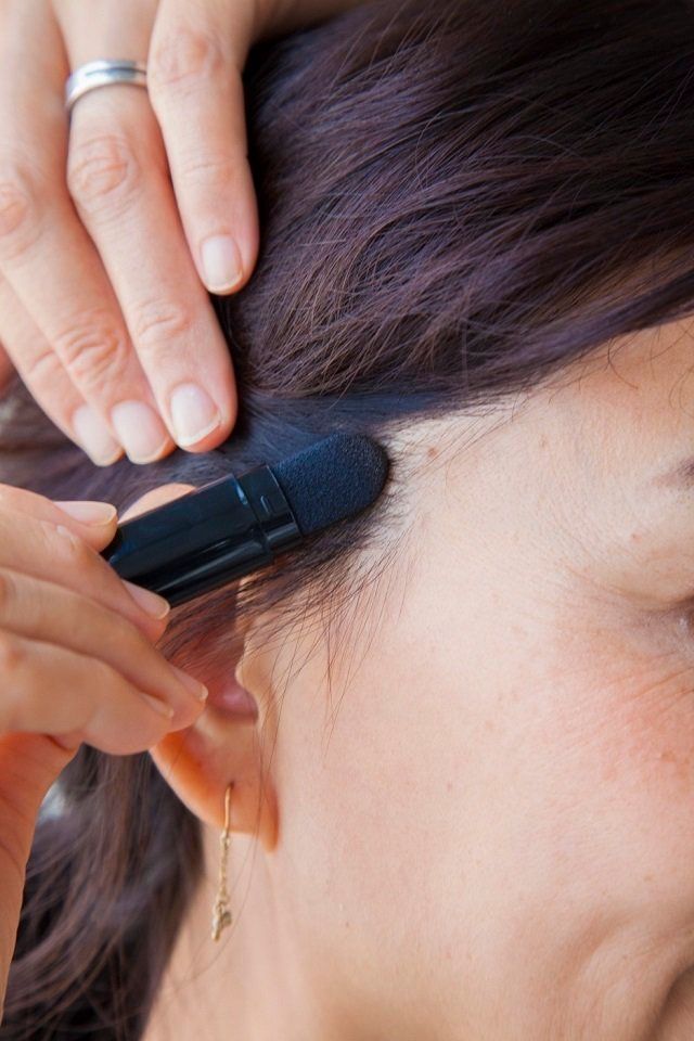 結び目に飾りゴムをつける。生え際の白髪が目立つ場合は、髪用のコンシーラーを塗る。