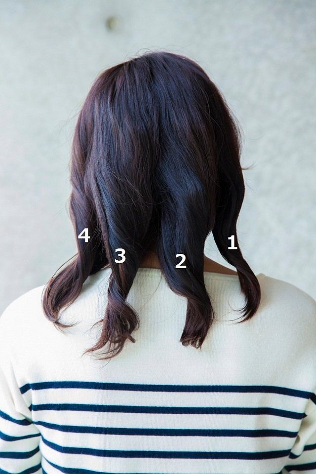 2の1と3の毛束を取り「くるりんぱ」をつくる。次に2と4で「くるりんぱ」をつくる。