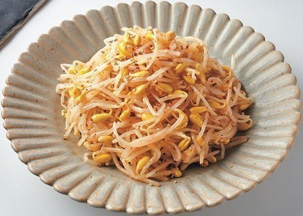 (1)大豆もやし2袋(400g)は熱湯に入れ、再び煮立ったら1分ほどゆで、ざるに上げてさます。