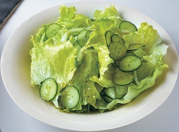 (1)レタス⅔個(250g)は食べやすくちぎり、きゅうり1本(100g)は輪切りにする。玉ねぎ(中)¼ 個(40g)は縦半分に薄切りにし、冷水にさらし水けをきる。