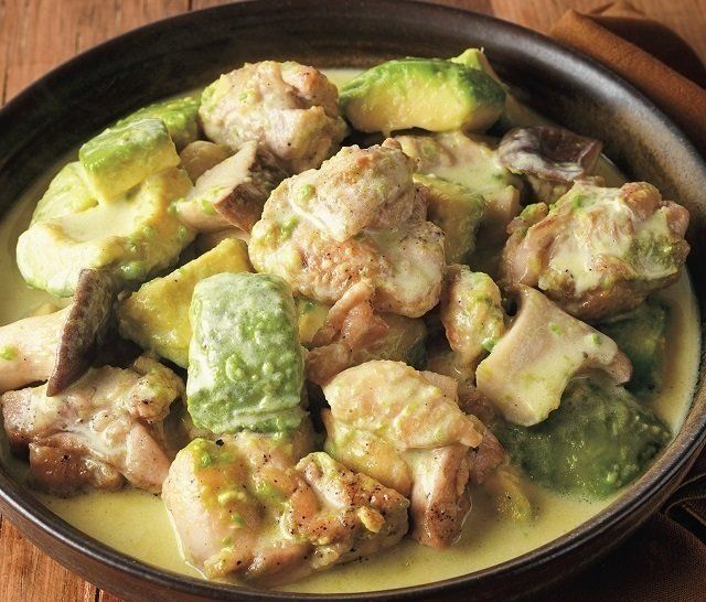 (3)アボカドは食べやすい大きさに切り、(2)に加えてやさしく炒め、Bをふって生クリームを加え、ひと煮する。