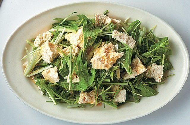 (1)水菜1袋(200g)は長さ4㎝に切り、冷水にさらして水けをきる。木綿豆腐1丁(300g)は手で食べやすくほぐす。