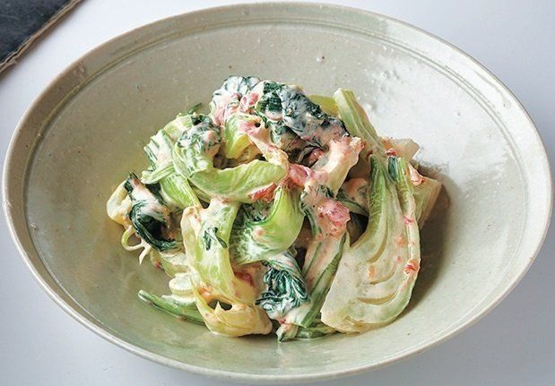(2)大きめのボウルに、マヨネーズ大さじ2、梅肉大さじ½ を入れて混ぜ、(1)を加えてあえる。