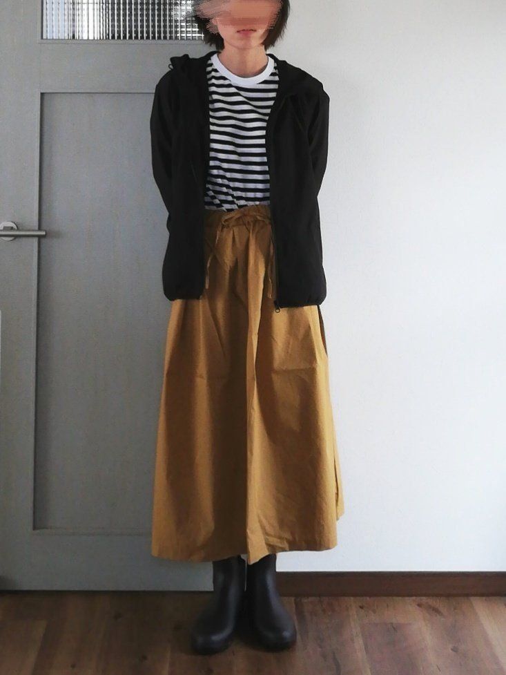 ボーダーT×ロングスカートのナチュラルテイストに、ショート丈のレインブーツがマッチ。ボーダーの黒とシェルパーカの黒をリンクさせてまとまり感ある着こなしに。