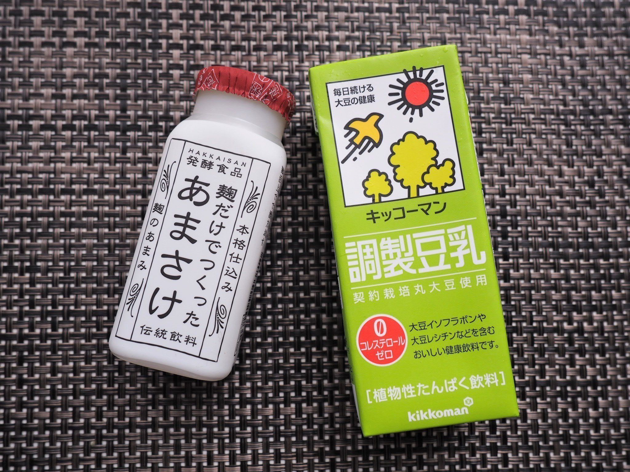 甘酒は疲労回復に期待される栄養素が含まれるため、夜に飲んで就寝中に疲れのケアに役立ててもよいでしょう。とろみと優しい甘味は単品で飲んでも空腹感を満たす助けになってくれるのですが、豆乳と割ることで飲みやすさがアップ。まろやかになります。好みの割合で混ぜてみて。メーカーはお好きなものをチョイスしてください。