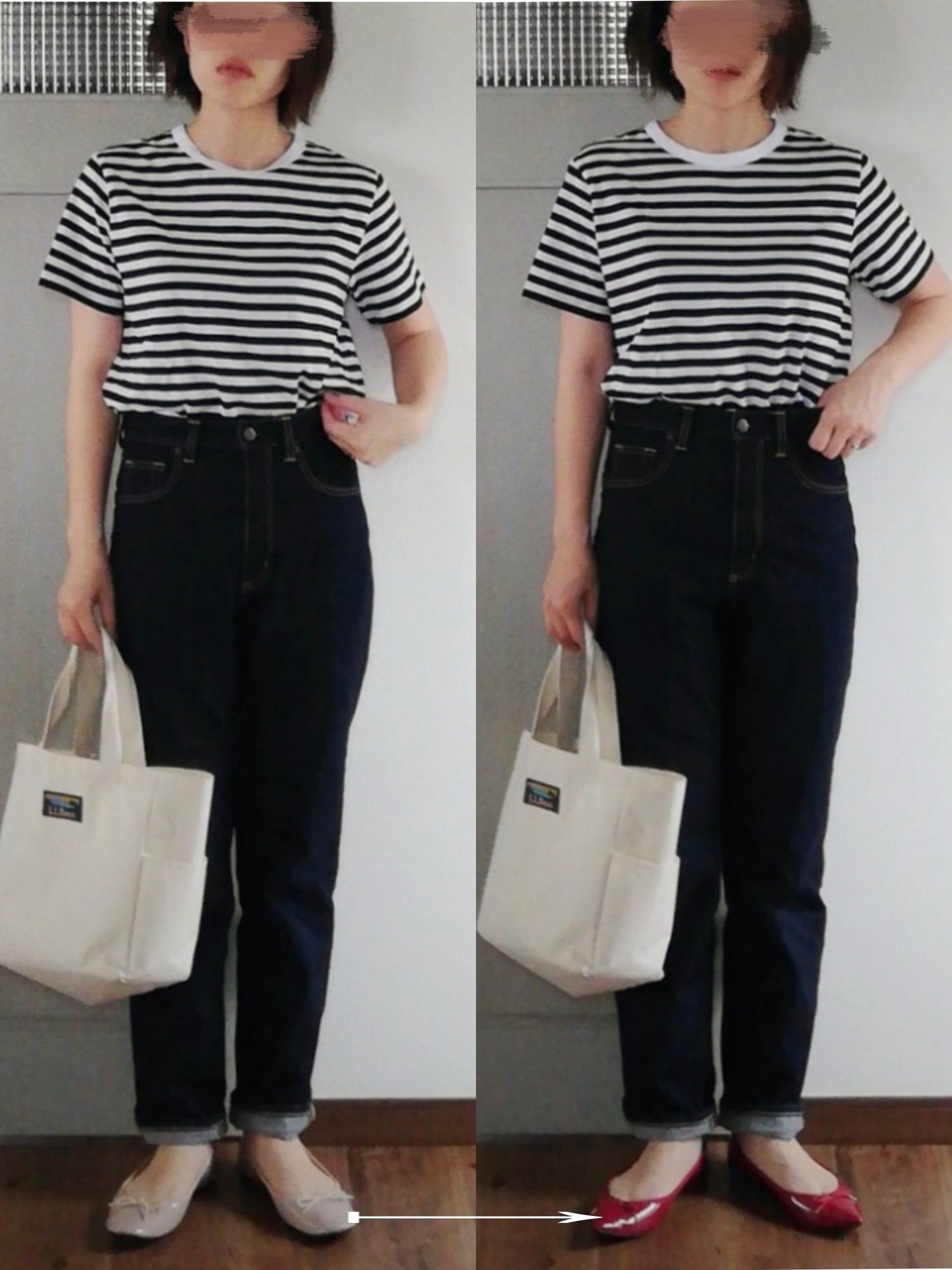 バレエシューズを赤に替えると、一気にあか抜けた雰囲気に。何気ないボーダー×デニムをワンランク上の着こなしにチェンジしてくれます。