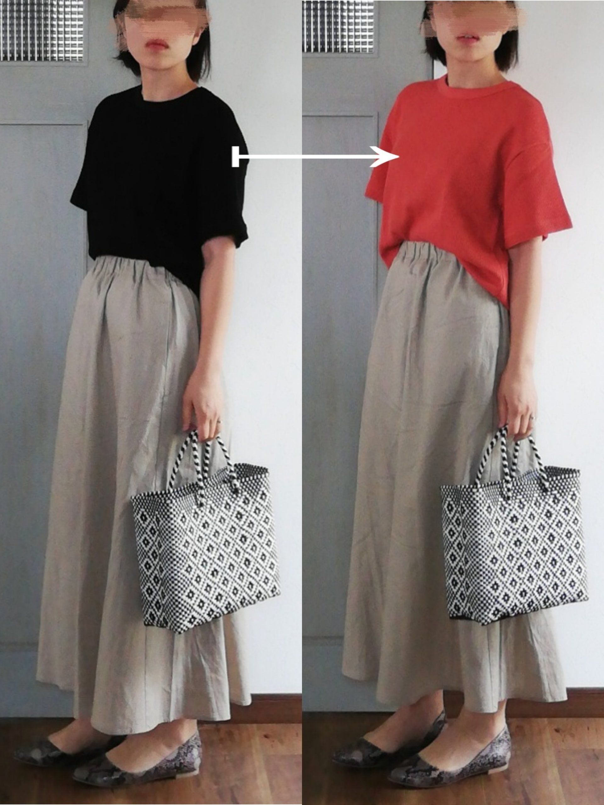 トップスをオレンジに替えるだけで、全体的に華やかな印象に。顔まわりに明るい色を持ってくるのが若見えのコツ。クールな印象の黒から優しく明るい印象のオレンジに変えることで、若々しさと好感度がアップ!