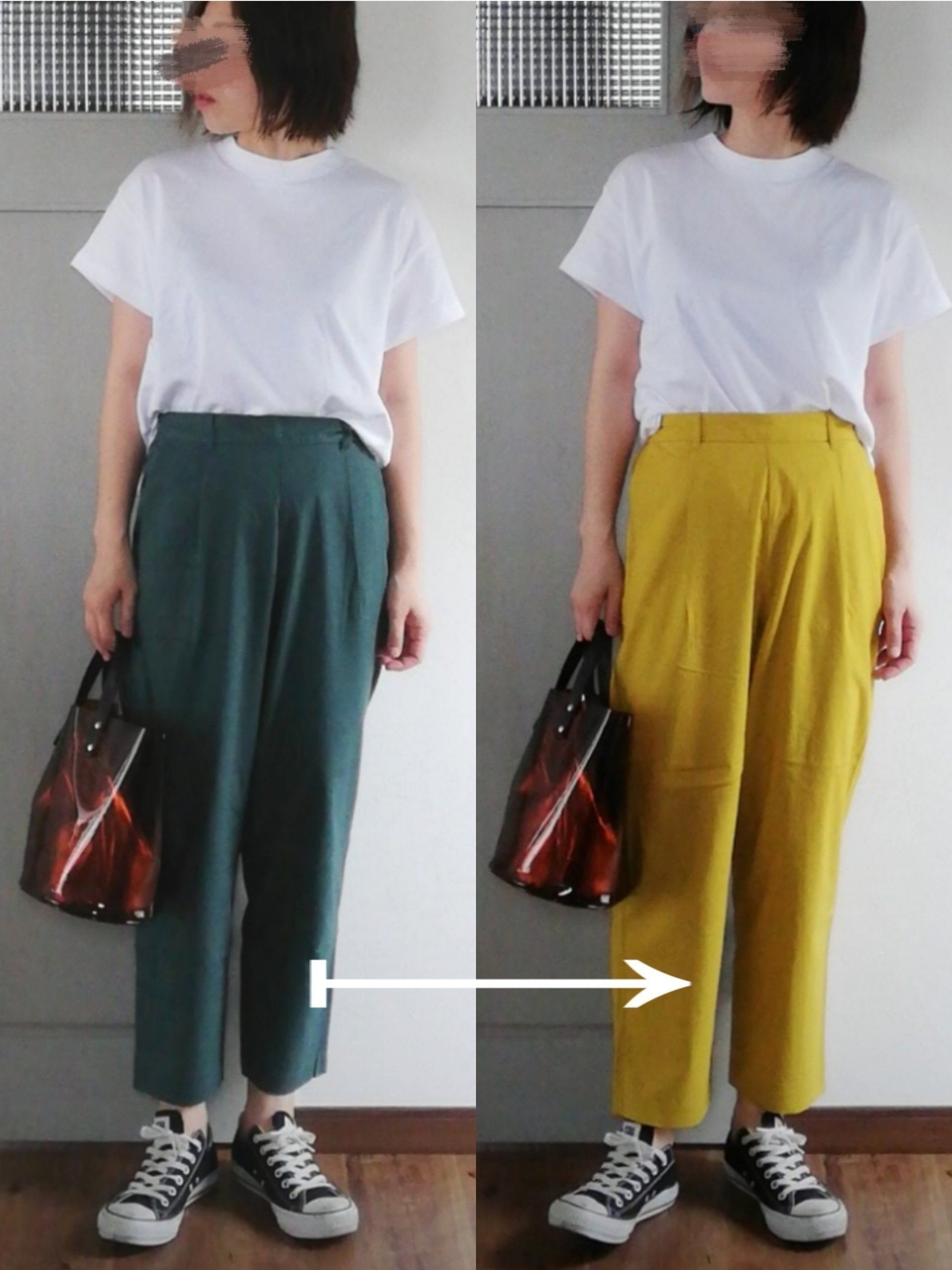 白T×グリーンのリネンテーパードパンツで大人シンプルな夏スタイル。このままだと落ち着いた雰囲気で「年相応」な印象が拭えません。