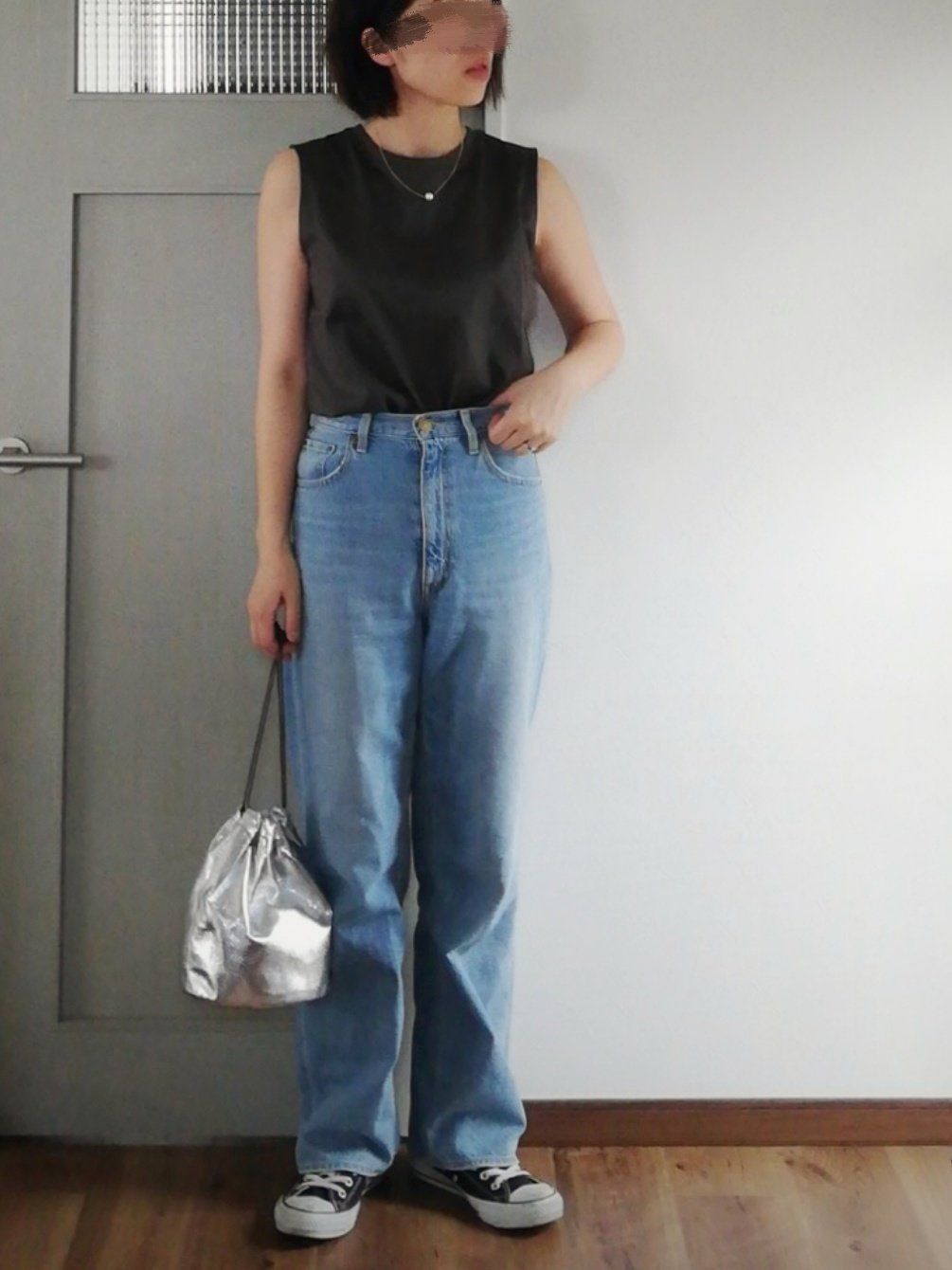 ノースリーブT×ハイウエストデニムのヘルシー夏カジュアルコーデ。定番のデニムなら、ノースリーブも気負いなくチャレンジしやすいのでおすすめ。ライトブルーの色落ちデニムに合わせて、夏らしい軽さを出した着こなし。
