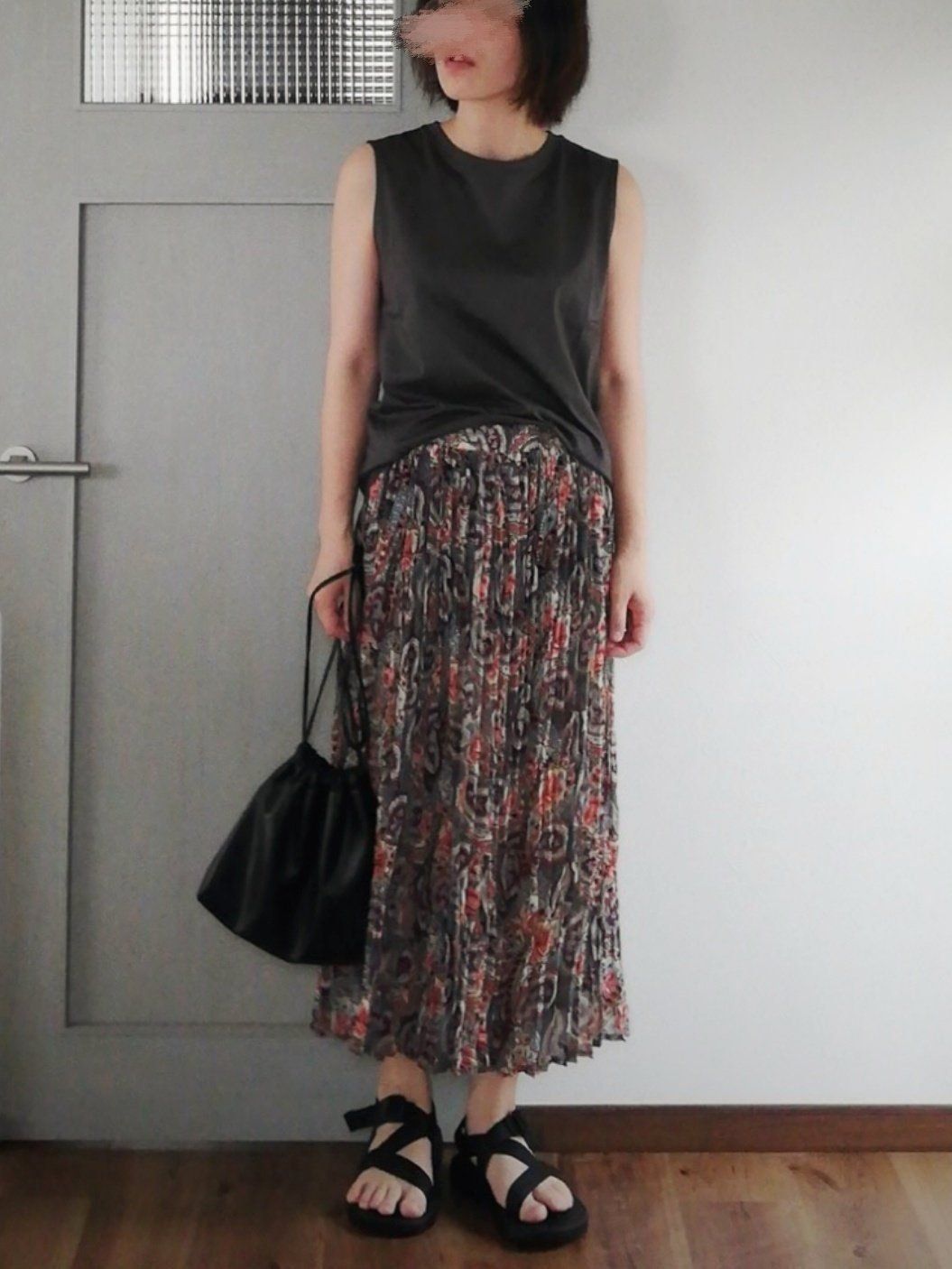 ノースリーブT×柄ロングスカートの夏らしいリゾート風リラックスコーデ。ロングスカートなら露出も少なく、ノースリーブも抵抗なく着れますよ。柄の中から1色を拾ってトップスと合わせると、統一感ある印象にまとまります。