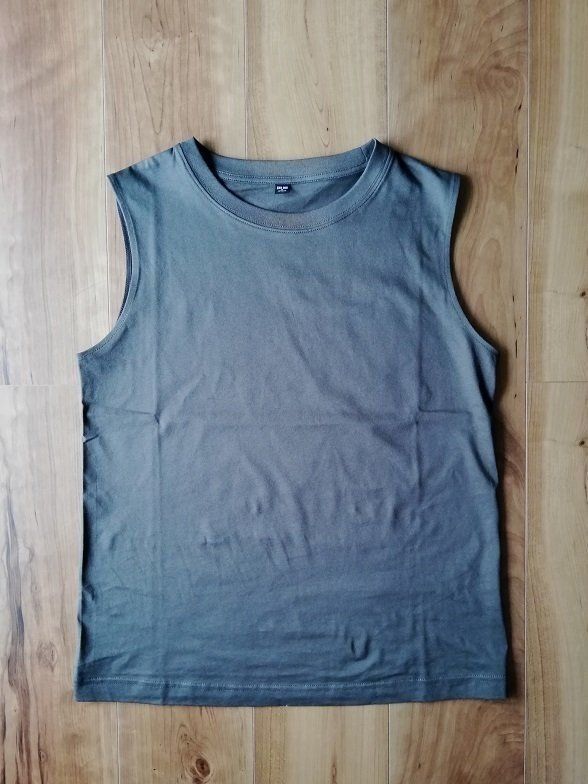 ユニクロのマーセライズコットンT(ノースリーブ)は¥1,000。シルクのような美しい光沢感が上品な印象。合わせやすいベーシックなシルエットなので、いろいろなコーデに着まわしできる優秀アイテムです。絶妙な色合いが高見えするグレーをセレクトしました。