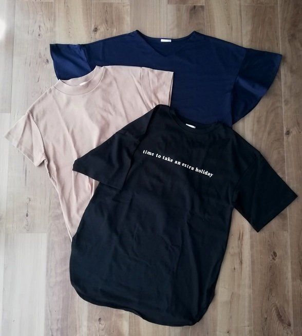 上から順に、フリルスリーブT(¥590)、スムースT(¥990)、オーバーサイズロゴT(¥1,490)。オンオフ使えるきれいめTシャツに美シルエットな人気Tシャツ、トレンド感あるオーバーサイズTシャツをセレクト。大人女子も使いやすいベーシックカラーを選びました。