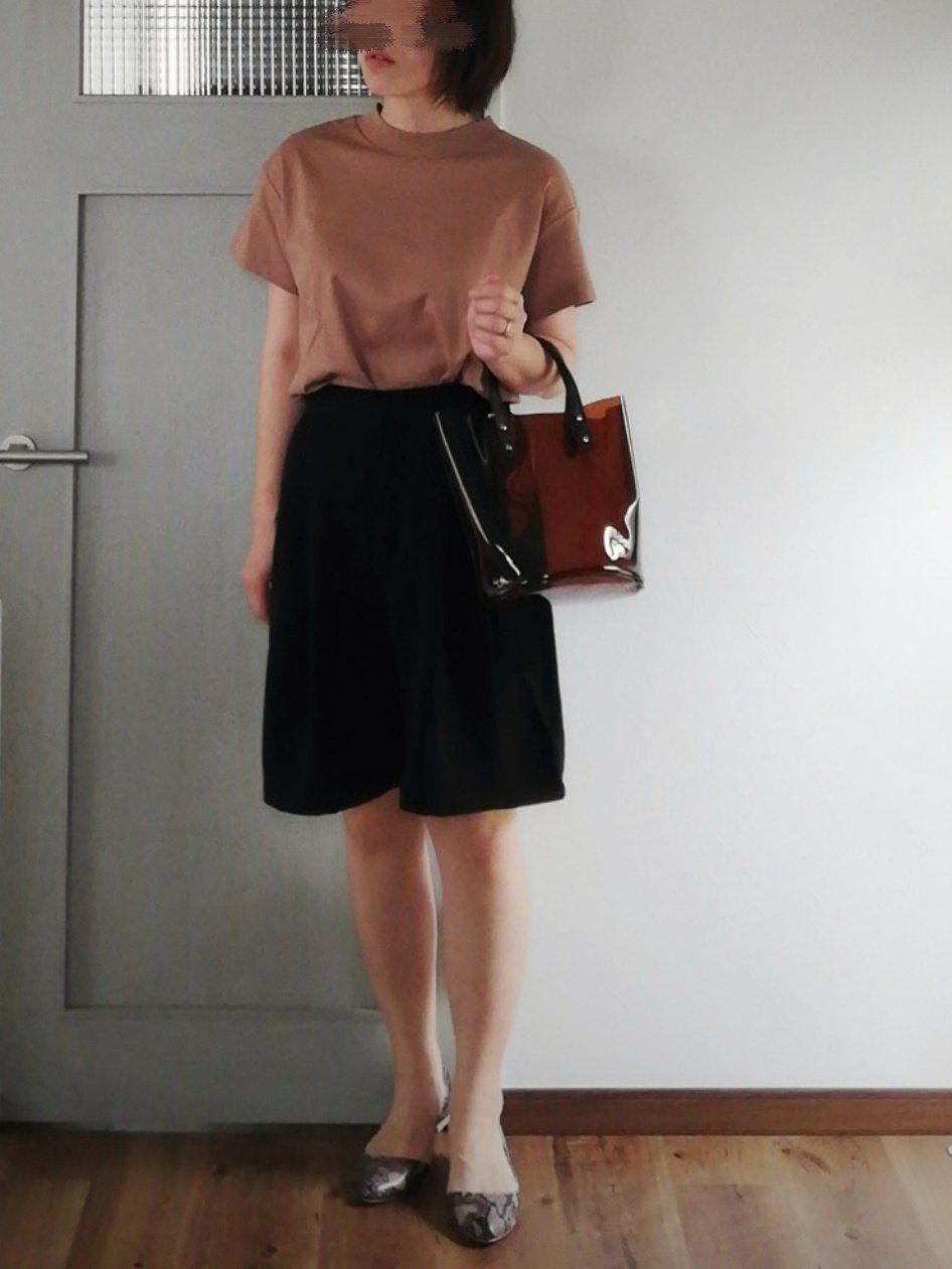 きれいめハーフパンツと合わせてクリーンな印象の夏コーデに仕上げました。パイソン柄パンプスやクリアバッグでアクセントをプラスして、地味になりすぎない大人コーデに。